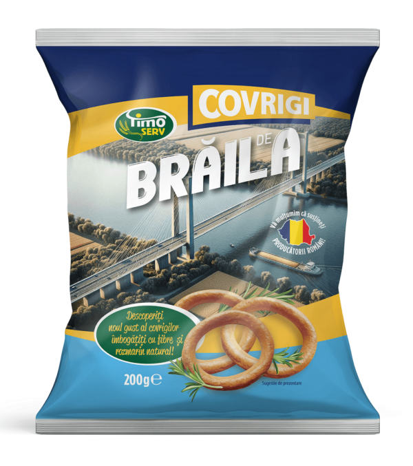 Covrigii de Brăila cu rozmarin reprezintă o reinterpretare modernă a unei gustări tradiționale. Acești covrigi mari și rotunzi sunt fabricați dintr-o combinație unică de făină albă, tărâțe de grâu pentru un plus de fibre și rozmarin mărunțit, care adaugă o notă subtilă de prospețime și arome mediteraneene. Rețeta lor specială, nou creată, asigură o textură perfect crocantă la exterior și moale la interior. Acești covrigi ideali pentru a fi consumați simpli, alături de brânzeturi, mezeluri sau în combinații creative, fiind o alegere excelentă pentru cei care caută o gustare sănătoasă, dar cu un twist gourmet.